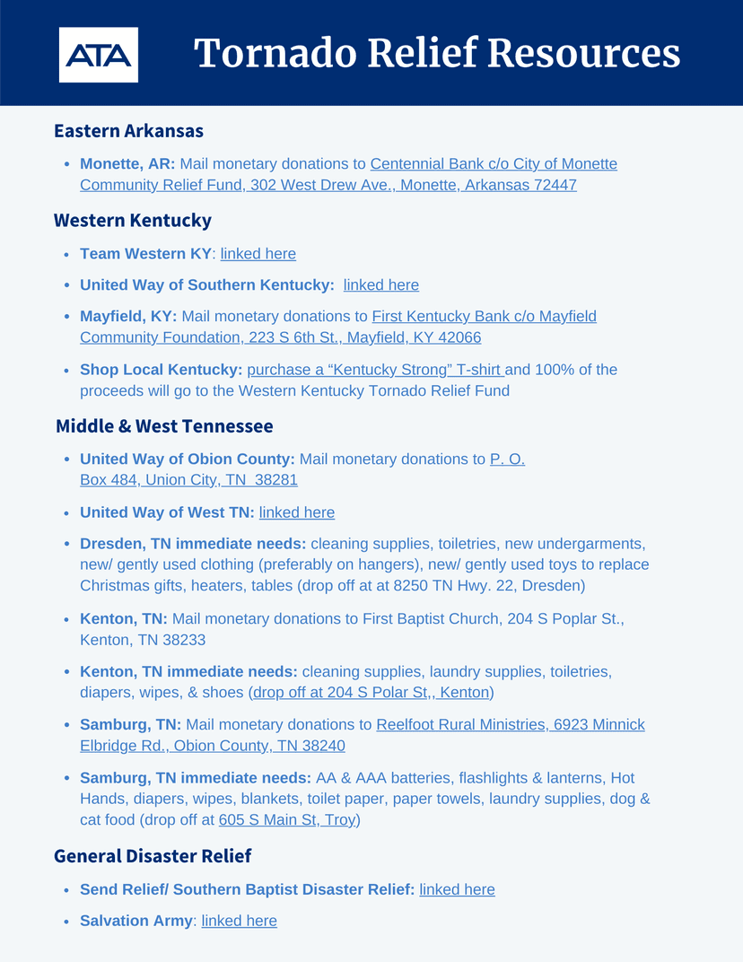 Dresden, TN immediate needs: cleaning supplies, toiletries, new undergarments, new/ gently used clothing (preferably on hangers), new/ gently used toys to replace Christmas gifts, heaters, tables (drop off at at 8250 TN Hwy. 22, Dresden)